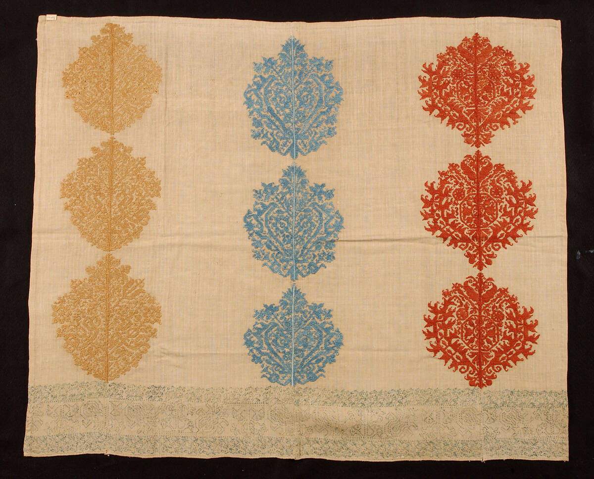 DescriptionOn each cloth, three vertical rows of three floral and foliate medallions per row, resembling the Glastra pattern. Eac row of a different design and color: red, blue, and buff. Raised and dense cross stiches. Bottom borders in green thread running stiches of beetles and flowering plants.