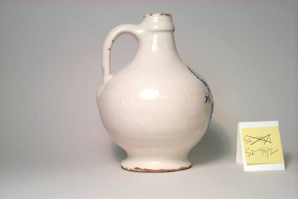 DescriptionNarrow-necked, bulbous bodied jub decorated in blue with crown, C.R., "Claret", and the date 1649.
