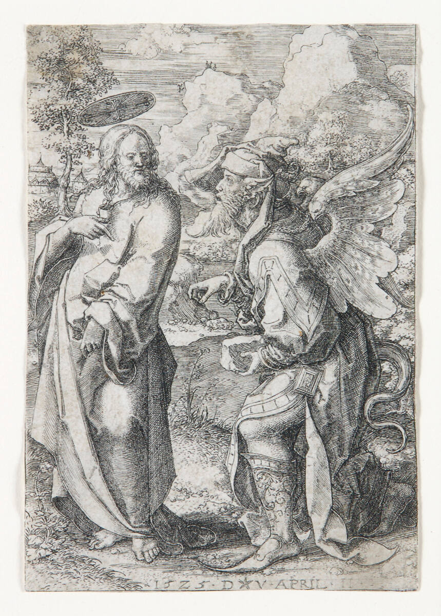 This etching illustrates the first of three occasions during which Satan challenged Jesus, the Son of God, to use his divine powers. Identified by the snaking tail protruding from his elaborate garment, Satan urges Jesus to convert the stone in his hand into bread. The fallen angel's crouching stance and grasping, claw-like right hand further underscore his depraved nature. Jesus rejects Satan's challenge, expressing his disdain by pulling aside his garments.