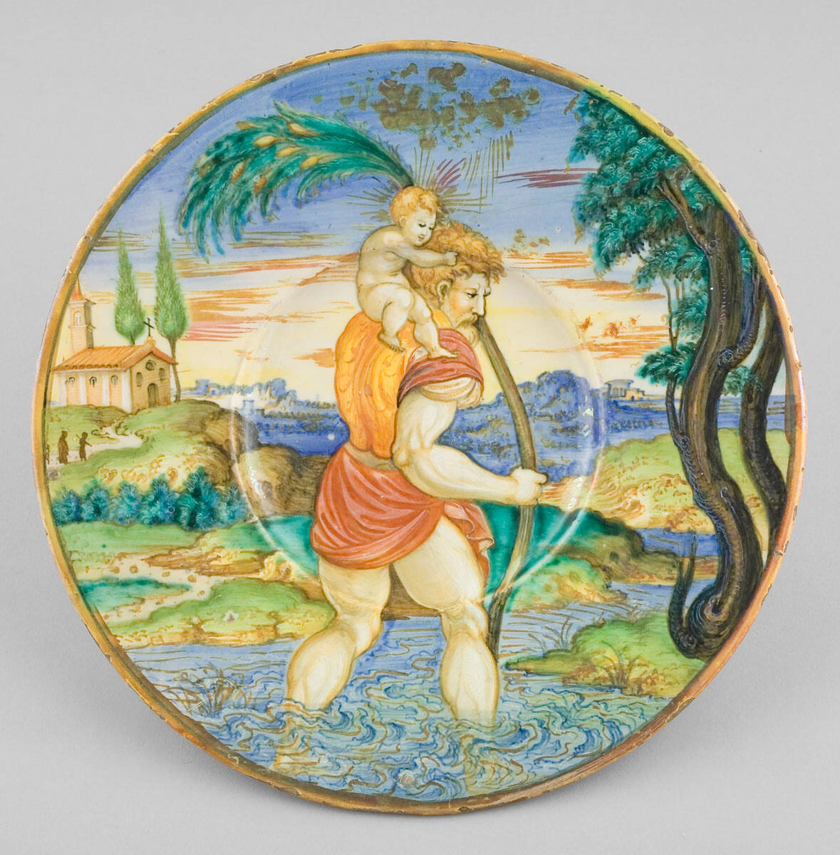 As his service to God, Saint Christopher (ca. 3rd century CE) chose to carry travelers across a raging river. This dish depicts the saint carrying a child who later identifies himself as Jesus. To prove his claim, Jesus instructed Saint Christopher to drive his staff into the ground; it miraculously became a palm tree bearing fruit, as shown here in the saint's hand. This refined, figural rendering was probably executed by Nicola da Urbino, a well-known Renaissance maiolica painter. After the colorful design had been fired, the dish was sent to Gubbio, a town famous for its lustre work, where iridescent highlights were applied.