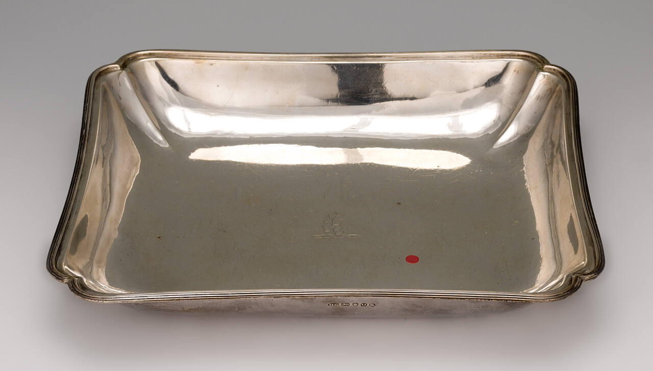 DescriptionShallow container with flat bottom and reeded rim indented at each corner; engraved leaves and stem design in center. Marks on underside: HC, lion passant, leopard's head crowned, date u, George III.
