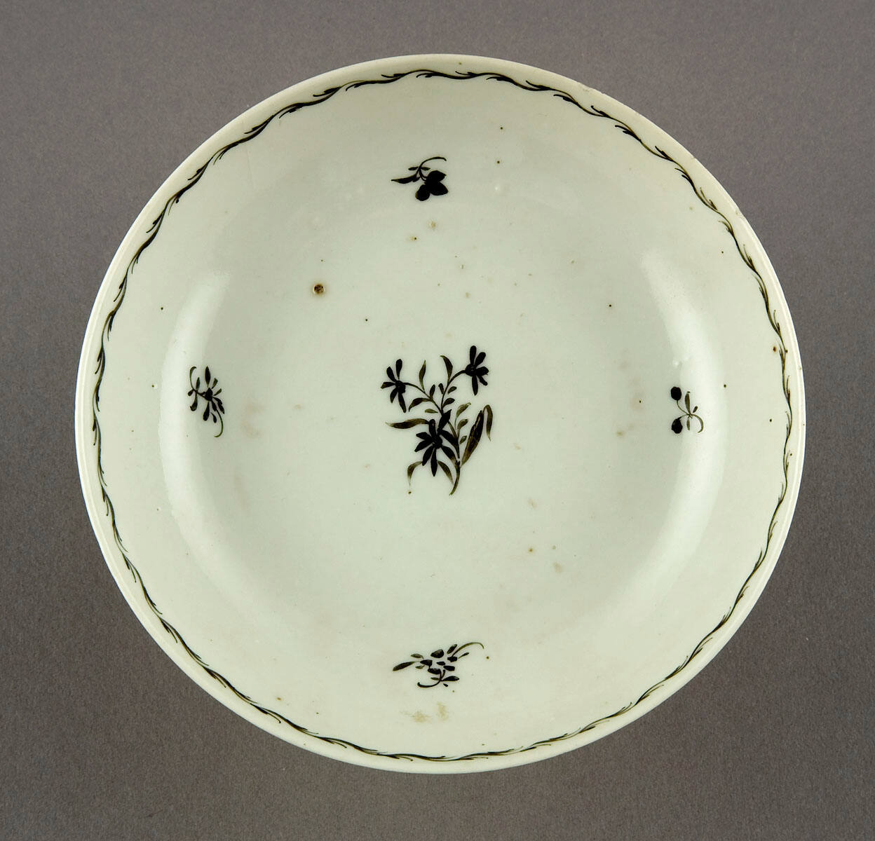 DescriptionExportware: soft white paste body with semi-transparent white glaze. Sparse overglaze floral patterns on interiors of both pieces and on exterior of teabowl painted in sepia and gold.