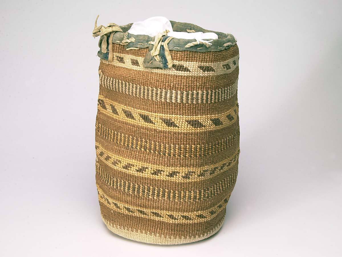 DescriptionTwined storage bag of cylindrical shape. natural dyes. finished in old denim.