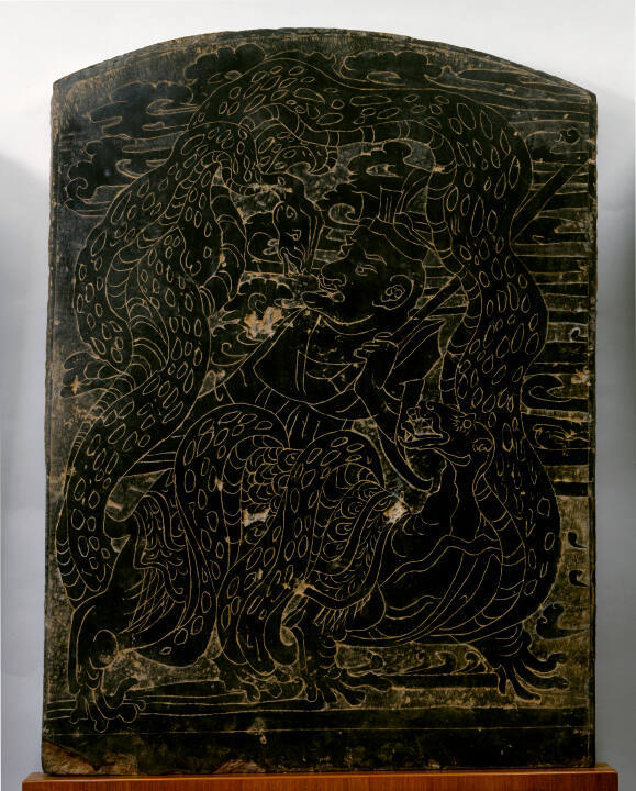 This section of a stone sarcophagus is believed to have come from the tomb of Lady Yuan. Born to a noble family, she likely chose to decorate her sarcophagus with scenes of Confucian virtues to demonstrate her status. The virtues displayed here exemplify filial piety—the duty of a son to look after his parents, or a brother to look after his siblings—a cornerstone of Confucian beliefs. What is remarkable about these scenes on the assembled sarcophogus is the way the artist has skillfully integrated landscape and narrative into the composition. Each episode occurs in a “space cell,” the frame defined by the landscape motifs with foreshadowing treatment. The landscapes evoke the mood of the stories and underscore the didactic message. Note the tree with two main trunks: Confucian texts indicate that when virtue permeates all things, double trees will appear. episodes in landscape settings, but the vertical compositions are more condensed than the earlier engravings.