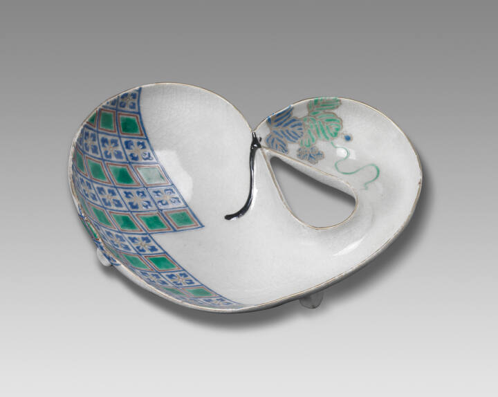 DescriptionBuff body covered with crackled translucent white glaze; main cavity decorated at bulbous end with zig-zag field of diamonds and squared quatrefoils in a repeated parallelogram grid in blue, green, iron-red, and gold overglaze enamels; cluster of vine leaves in similar enamel palette hangs from rim of secondary cavity spreading into the interior; gourd-shape curved areound to form a closed comma shape with black enamel stem trailing from gourd top into body cavity; four loop feet on bottom.Exhibition HistoryOn Loan, Josyln Art Museum, Omaha,