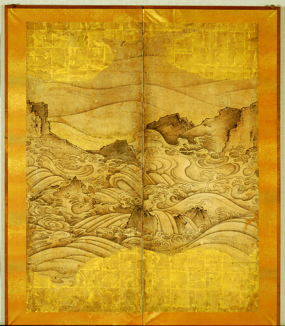 DescriptionAngular rocks rendered with stiff, smooth outlines, sharp "axe-cut" strokes, and smooth, hard gradated washes, above which great bollowing waves, rendered with long, smooth strokes and gradated washes at the edges, and clouds in gold leaf; and below, between the rock formations are crashing and foaming waves; and a cloud formation in gold leaf. Extensive abrasion and tearing; small flecks of gold paint were added later to mask obtrusive damage. Size, thickness of paper, and damage suggest that these were once fusuma.ProvenanceH. Kimura, Nara City, Japan, by April 21, 1965;