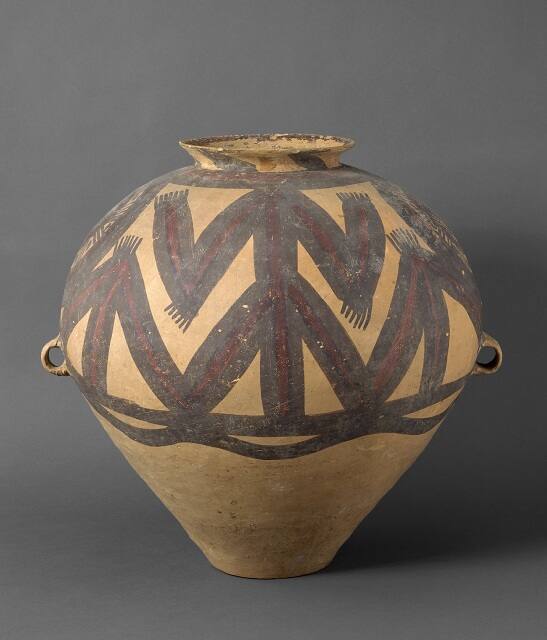 This painted jar is typical of pottery vessels found at Machang sites, the latest phase of Majiayao culture in lower Gansu province, a region occupied by many ethnic groups during the Neolithic period. The black and red zigzag lines, which comprise the mysterious motifs in Majiayao pottery, resemble the four limbs of a headless animal. On vessels of an earlier version, a painted circle, though faceless, represents the head of the four limbs. In this example, the circle is integrated with the vessel rim, as shown from the top in the inserted photo. It has been suggested that these motifs represent the images of supernatural beings.
