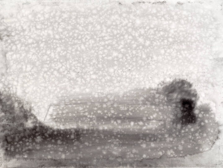 DescriptionHorizontal format ink wash painting in broad soft gray strokes. Centally-placed long barn with low peaked roofline contour-sketched with brush handle end directly into moist paper. White "snow" pattern overall created by raindrops falling onto wet painting.Copyright© Suzanne Chamlin