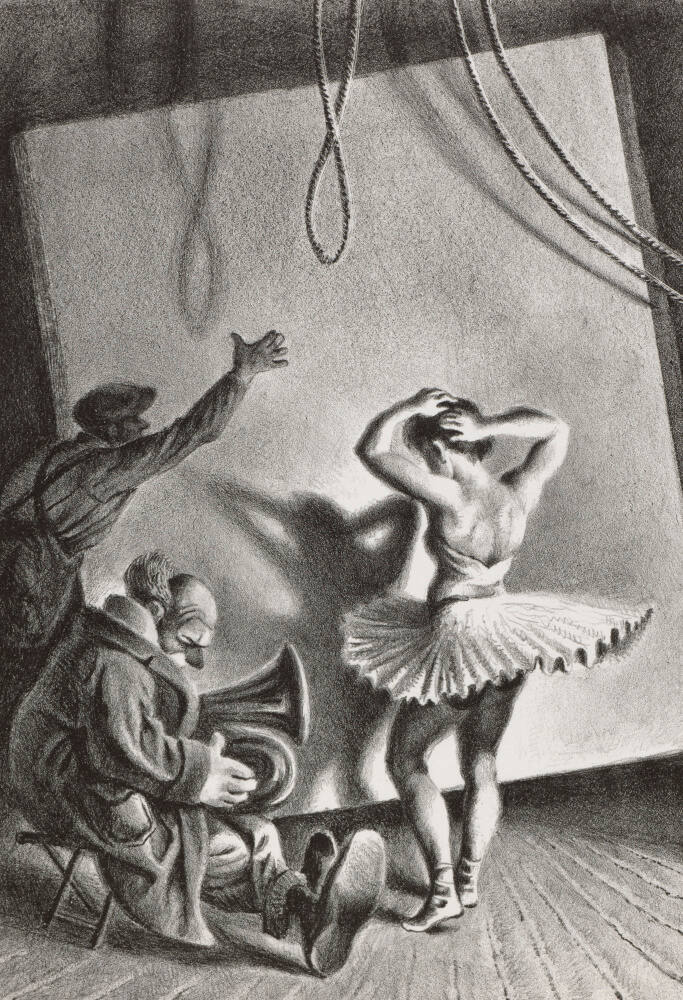 DescriptionBehind the scenes at the circus. A clown rests on a chair, an acrobat adjusts her hair, and a stagehand either moves a prop or reaches for a rope.Copyright© Estate of Georges Schreiber / D. Wigmore Fine Art, Inc.