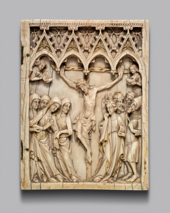 These three intricately carved ivory panels are the right halves of two-panel devotional objects, called diptychs.  They depict the Crucifixion of Christ, a popular subject matter for ivory diptychs.  In all three, the scene is set within a framework of Gothic architectural elements, including trefoil and pointed arches.  Finely formed details in the ivory emphasize the figures' mournful expressions and ornately draped robes.