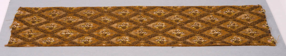DescriptionSimple floral motif of brown, green, white in a diaper pattern of brown on gold.