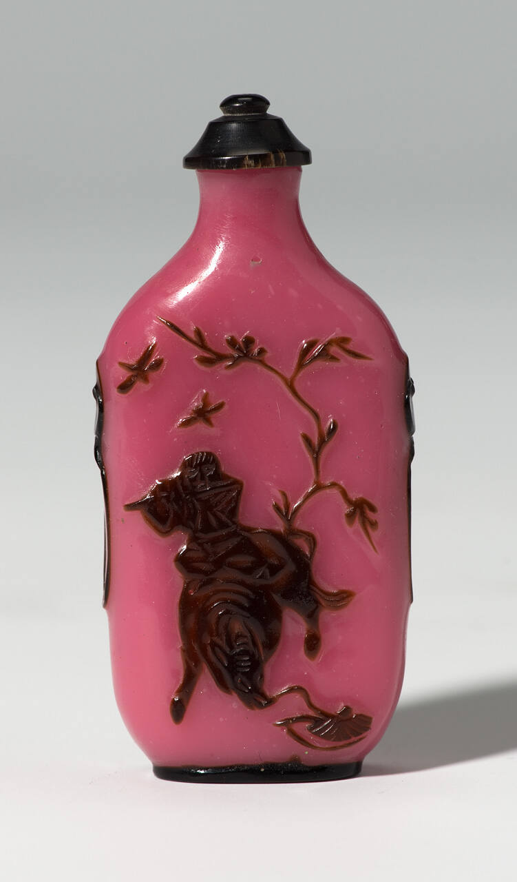 DescriptionFlattened rectangular seal-type bottle with sloping shoulders, deep pink Peking glass overlay with brown design of a boy playing flute on the back of an ox underneath a tree with a bird in flight on one side and on reverse, a horseman riding under a flowering tree above rock work and plat with a bird in flight, ogre mask, and ring handles on shoulders, with black horn stopper.