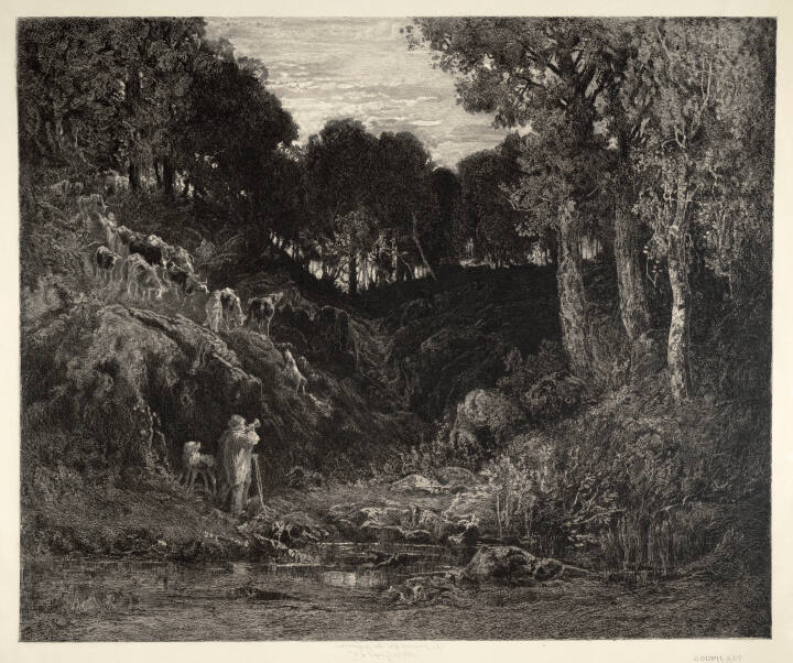 [1] See inscription and stamp on bottom of etching. Goupil owned the Théodore Rousseau painting, Cows Descending the Hills at Sunset (or The Ravine; Nelson-Atkins, 30-11), upon which the etching is based, between April 3 and June 23, 1880. This may have been when they commissioned the etching from Chauvel. It is possible that the etching accompanied the painting as it moved between collectors and dealers until 1930. See the painting’s provenance here: https://art.nelson-atkins.org/objects/24339/cows-descending-the-hills-at-sunset.