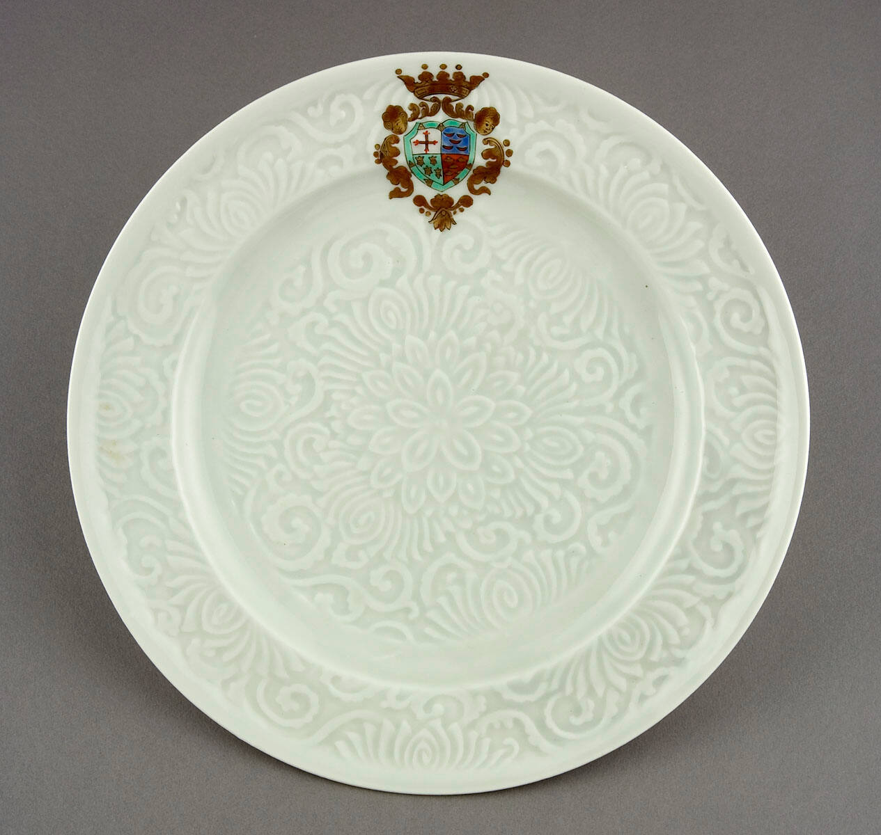 DescriptionPlate with depressed center and 1 1/4 " wide rim, raised white on white patterns of floral, S and C curves on rim and in center, smooth areas at outside edge of rim and outer part of depressed area, armorial design in gold leaf, red, blue and green placed at one side.