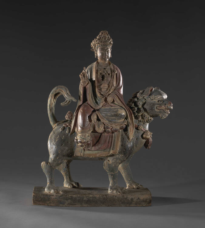 DescriptionFigure in a red robe seated sideways on a lion, with right hand raised, left leg bent. Lion painted blueExhibition HistoryOrigins: Collecting to Create the Nelson-Atkins, The Nelson-Atkins Museum of Art, Kansas City, MO, August 14, 2021-March 6, 2022.