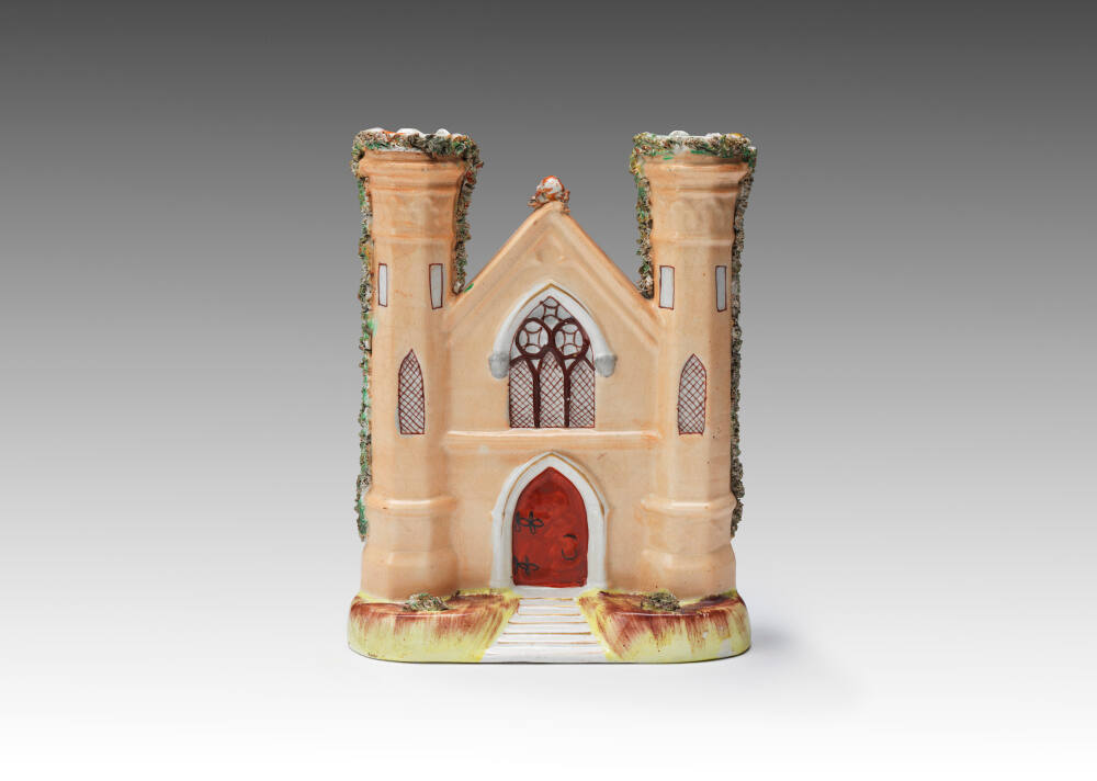 DescriptionTwin-towered church with gothic windows and door. Pale salmon with vermillion arched, recessed door. White door and upper window framing; touches of gilt. Vines on towers in dull greyed green. Yellow grass on base with reddish-brown paint.Exhibition HistoryCastles, Cottages, and Crime, The Nelson-Atkins Museum of Art, Kansas City, Missouri, July 10 2021–March 06 2022, no cat.