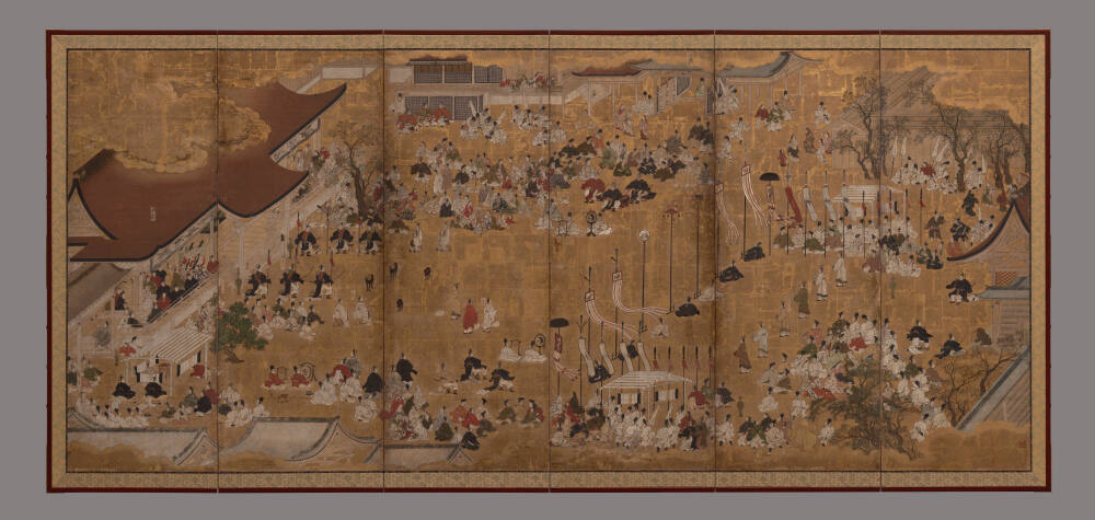 Most Japanese folding screens are designed in sets of two or four. Sometimes they are united by a single composition, moving from right to left. Here, the scenes are complementary rather than continuous. The right screen portrays the actual enthronement rites. The left depicts an unidentified procession.