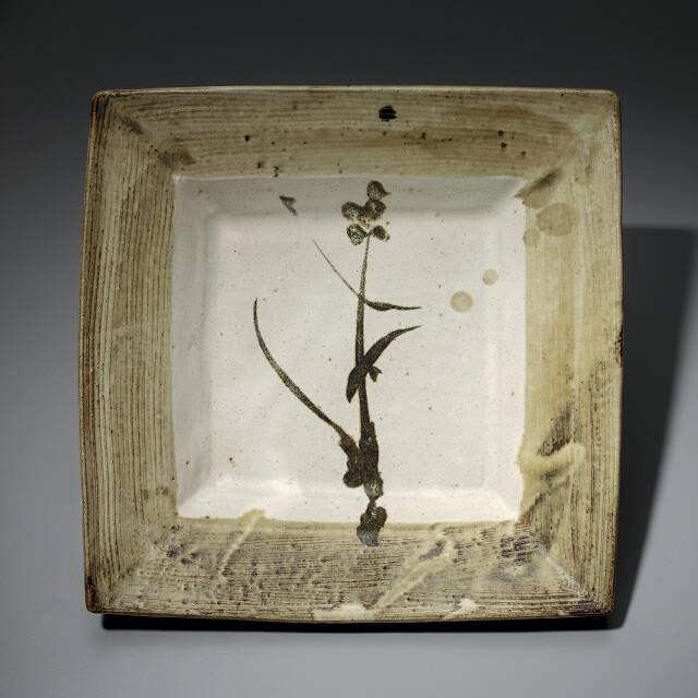 DescriptionHeavily potted buff grey body moulded to a square shape with pronounced central depression surrounded by a heavy everted flat lip; interior of lips decorated with parallel striations; exterior and base covered with thick greyish white glaze; interior lips first glazed with iron-brown then with a layer of grayish white that also coveres the central depression, where a final brushing of iron-brown decorates the interior with a sprig of wild grass and blossom.Gallery LabelShoji Hamada said, "There are many ways of approaching work, but mine is action." Employing centuries-old production methods, his dish derives beauty from both its utilitarian function and its spontaneous decoration. Hamada and a group of artists initiated the mingei movement (folk crafts or people's crafts) to preserve traditional Japanese techniques and styles. These artists admired the individual quality of handmade works in contrast to the popularity of mass-produced objects.