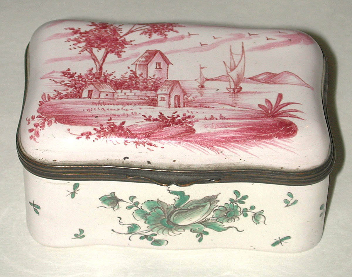 DescriptionIrregularly rectangular box of white porcelain with hinged lid and brass mount. Decorated with pink enameled landscape on top in which are several houses and two ships. Around the sides are green enameled flower decorations.ProvenanceMargaret Cameron Chapman (née Mann, 1865-1935), Kansas City, MO, by 1935;