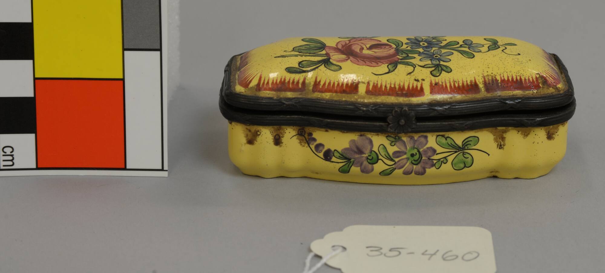 DescriptionIrregularly rectangular yellow porcelain box with hinged lid and brass mount. Decorated with enameled vari-colored flower designs on the top and sides.ProvenanceMargaret Cameron Chapman (née Mann, 1865-1935), Kansas City, MO, by 1935;