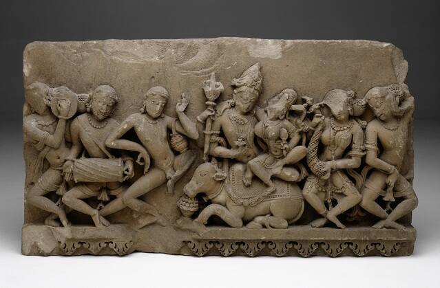 This finely-carved relief was once part of a long frieze that decorated the famous Shiva Temple at Harshagiri in Rajasthan. In the center, the Hindu god Shiva and his wife, the goddess Parvati, sit upon Shiva’s Mount Nandi, surrounded by dancers and musicians. This dynamic scene may be a depiction of the divine couple’s wedding procession.