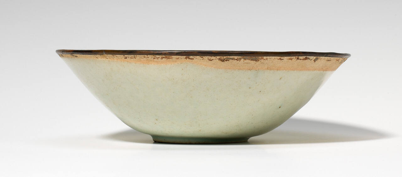 DescriptionBowl with a pale blue glaze, pressed flower designs inside, with a copper band around the rim.