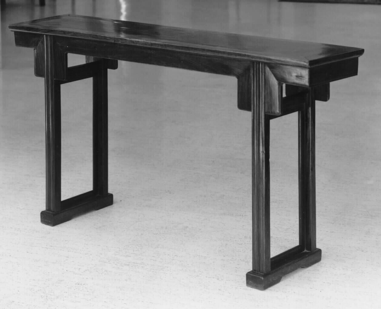DescriptionA huali rectangular table with single board flush floating panel top with a mitred mortise and tenon frame with square-section legs with a double incense stick beading cut to receive the mitred square-shaped beaded aprons. The legs are joined by a high square stretcher above a mitred inner frame and slab feet cut with a low bracket foot. Early 20th century.