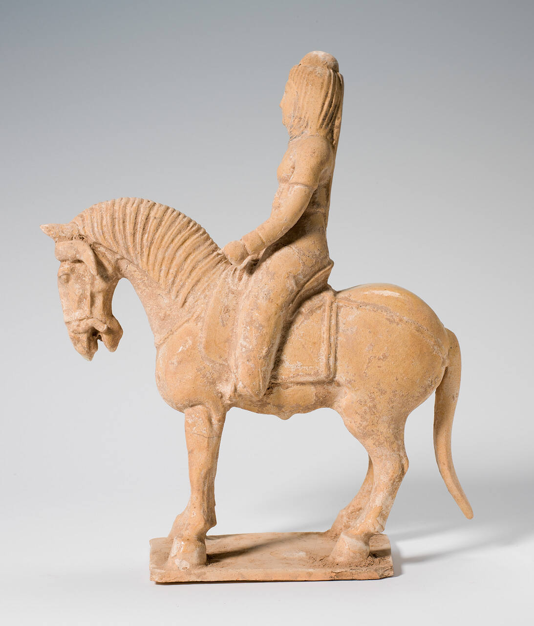 DescriptionTomb figure of a haorse with lady rider, dressed in trousers, short jacket, and wimple. a hat, also.