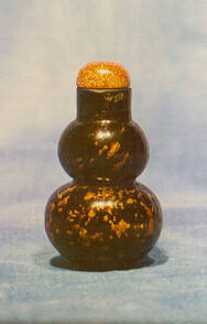 DescriptionDouble-gourd shaped Peking black glass bottle splashed with gold flecks and covered with a clear glass layer, gold stone stopper.
