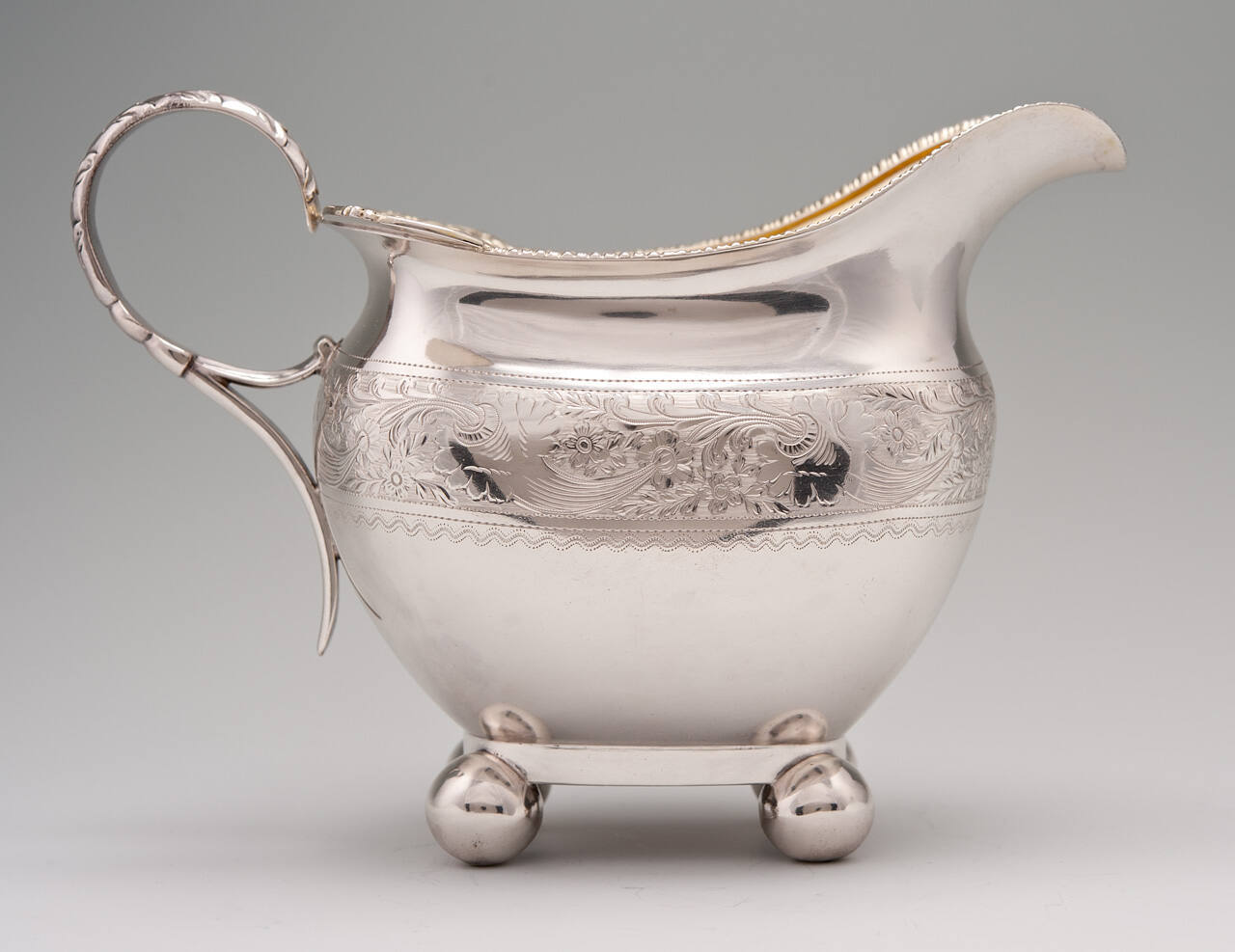 DescriptionRectangular boat-shaped body, with curved and tapered sides, stands on four ball-shaped feet. The rim is gadrooned and bears applied shell embellishments on the end to which th ehandle is attached. The shoulder bears a continiuous frieze of bright-cut floral engraving. Gold wash interior.