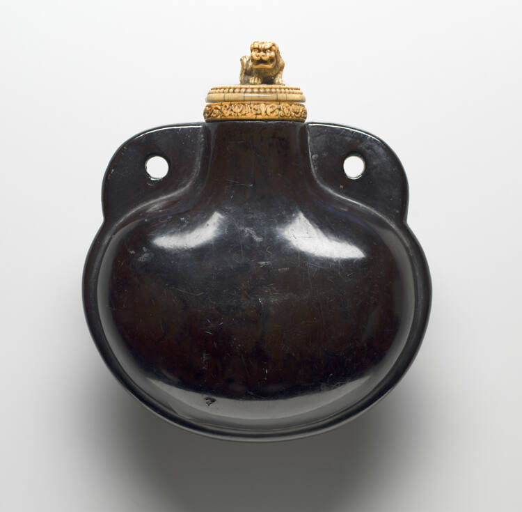 DescriptionFlask-shaped powder box with two ears; ivory cap with lion in full relief.