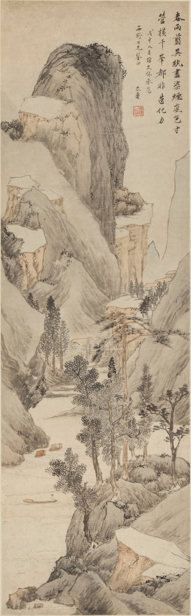 As read in the poem translated above, Pan Gongshou muses on the work of an earlier painter, Wen Jia (1501–1583), in the painting’s inscription. Pan admires how Wen captures the atmosphere of a scene with “just the touch of a brush.” Pan’s landscape follows this tradition by reinterpreting the work of Wen Jia instead of drawing directly from “nature’s creative forces.”