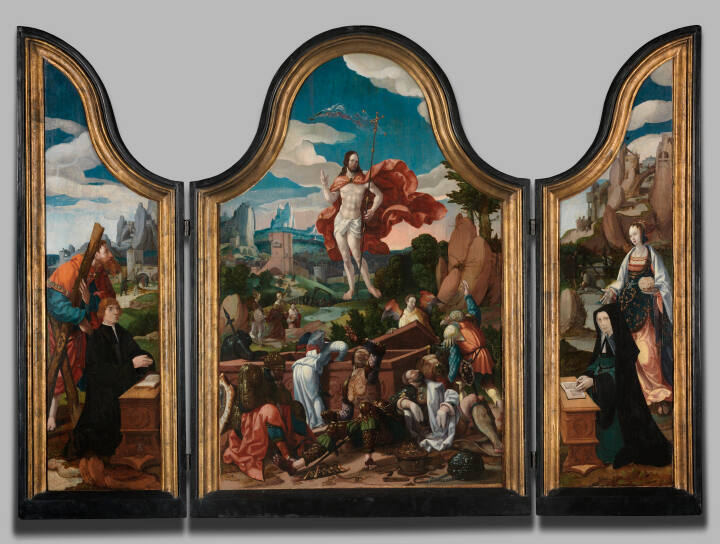DescriptionAltarpiece in three arched sections, outside wings may be folded over center. Center panel depicts the Resurrection, Christ ascending in the sky overhead while below are soldiers and angels around an uncovered sarcophagus; castle in landscape background. Left wing depicts St. Andrew at left standing behind kneeling male donor at prayer bench; in right wing, Mary Magdalene stands at right behind kneeling female donor at prayer bench.Exhibition History
