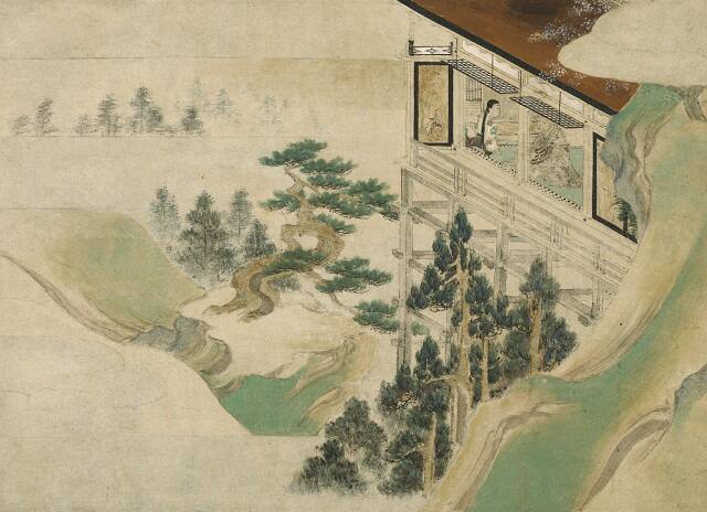 DescriptionOriginally, this painting was accompanied by a written narrative recounting the first episode of Illustrated Origin and Legends of Yūzū Nenbutsu (Yūzū Nenbutsu engi-e 融通念仏縁起絵). The scene takes place at Mount Hiei (Hieizan 比叡山), where the young Saint Ryōnin 良忍上人, at twelve years old becomes a disciple of the monk Ryōga 良賀. Inside a temple perched on a steep hillside, Ryōnin sits in front of his teacher Ryōga, who sits on green tatami. Ryōnin’s long black hair, tied behind him, and contrasts with his white robe and dark trousers. Through the raised lattice shutters, the two are seen in conversation, surrounded by verdant hills and distant trees whose softly brushed silhouettes fade into a mist, evoking the mountain’s tranquil remoteness.Gallery LabelThis painting was created to tell the legend and charitable acts of the Yūzū Nenbutsu school’s founder, Priest Ryōnin (1073–1132). The Yūzū Nenbutsu school was a subdivision of Pure Land Buddhism, which has flourished in Japan since the late 900s C.E. The school taught followers that they could be reborn into Paradise by merely repeating the nenbutsu or a simple mantra.