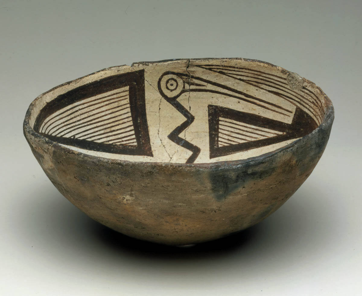 DescriptionShallow bowl with charcteristic Mimbres painted figurative decoration on the interior. The design represents an abstract bird form with circular body and outstretched wings. The neck of the bird is rendered in a zig-zag line ending in a small circular head with a long pointed beak. There is a circular hole and loss of clay body in the bottom center of the bowl.