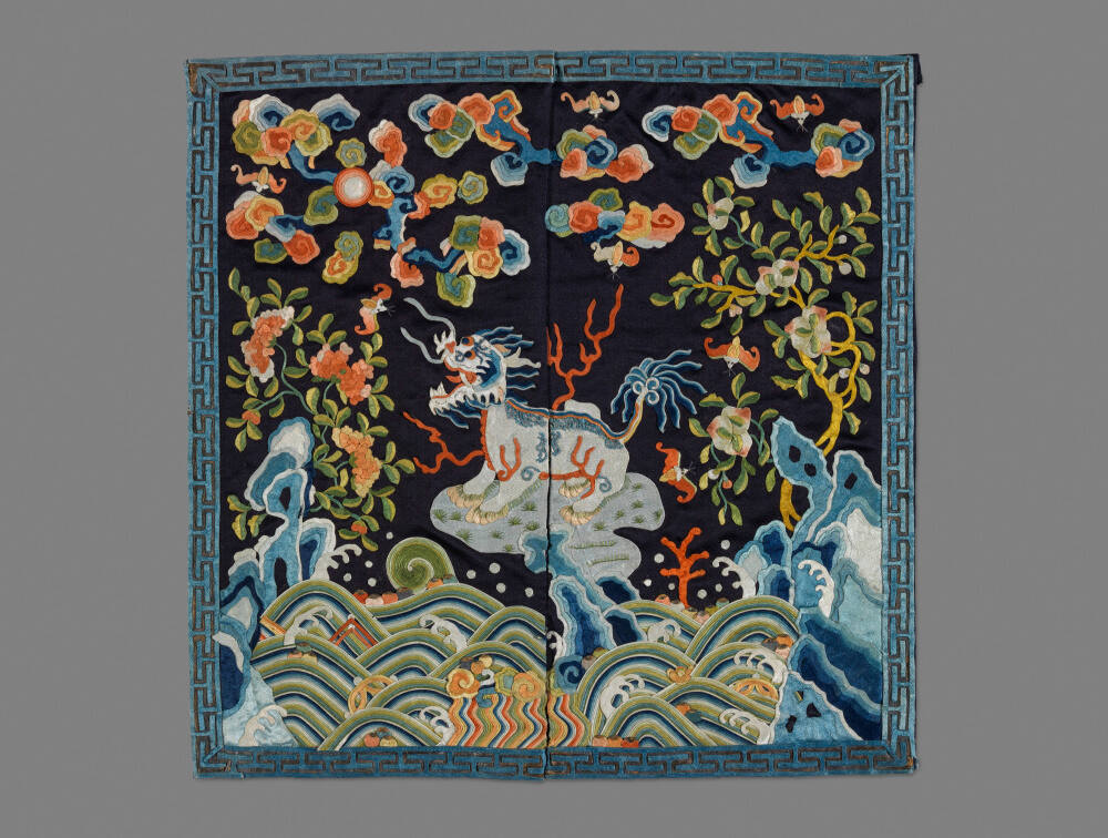 According to myth, the fantastical animal xiezhi have an objective sense of right and wrong. In the court, it represented the imperial censor, who oversaw the ethical behavior of officials. This creature has a scaled deer body and a dragon head with one horn. Here the xiezhi is made from applique of colorful silk satin.