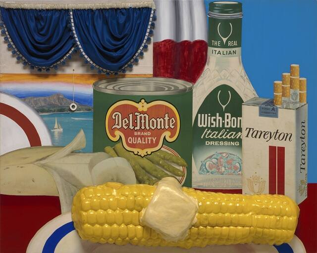 Still Life No. 24 is an assemblage composed of two-dimensional imagery and three-dimensional objects. Wesselmann cut images of foodstuffs and kitchen items from subway posters and other large advertisements. The plastic ear of corn is an advertising prop, acquired by the artist from a vendor on Coney Island who sold corn on the cob.