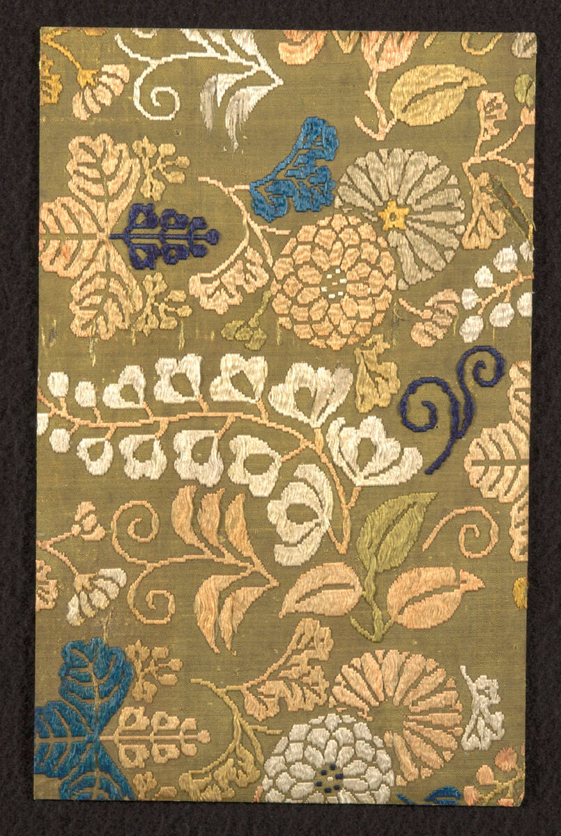 Fragment from Nō robe (atsuita type) with chrysanthemum, wisteria, and paulownia leaf design