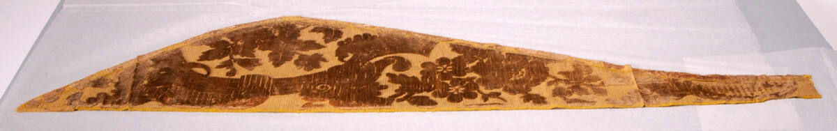 DescriptionConventionalized flowers and leafage of brown on background of yellow and gold thread.
