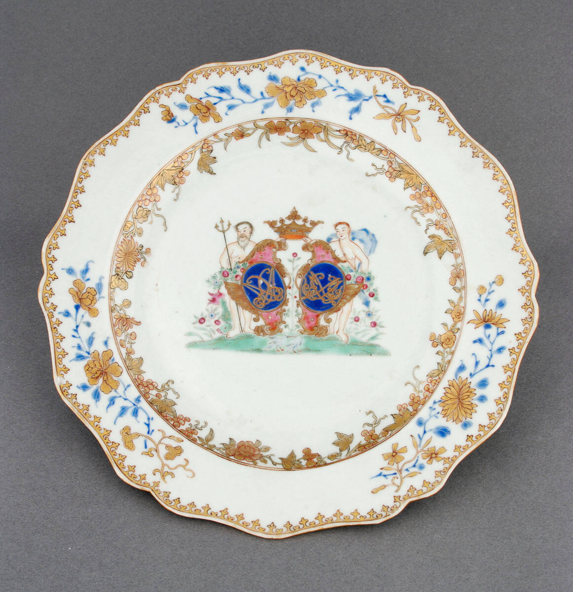 DescriptionPlate with two figures standing beside two shields enclosing an unidentified cipher. Borders of blue and gold floral decoration.