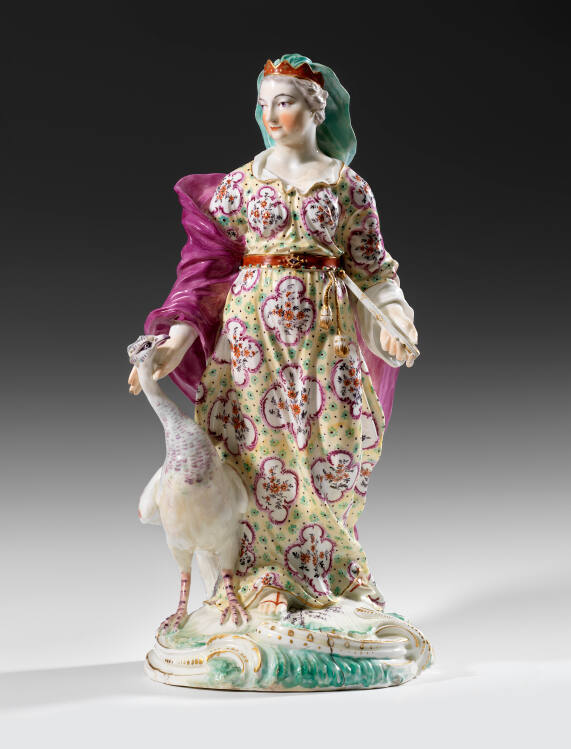 DescriptionStanding female, gray-haired wearing lavender cloak with black floral sprays on back, orange and gold diadem, light blue veil on back, orange sash with gold tassels over long yellow dress with black-centered green rosettes and rose quatrefoils; gold-tipped scepter in left hand, right hand around upper neck of peacock at her r., which has rose body markings, blue-eyed plumes.Exhibition HistoryLuxury and Passion: Inventing French Porcelain, The Nelson-Atkins Museum of Art, Kansas City, Missouri, August 13 2022–August 12 2024, no cat.