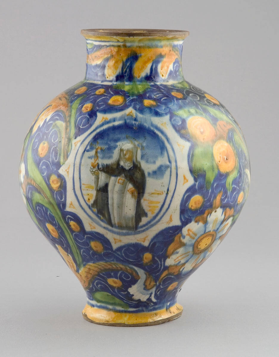 DescriptionPainted with conventionalized floral and fruit design s in orange, green and ivory on blue ground. Saint Sebastian pictured in medallion.ProvenanceWith Spanish Art Galleries, London, by September 2, 1931;