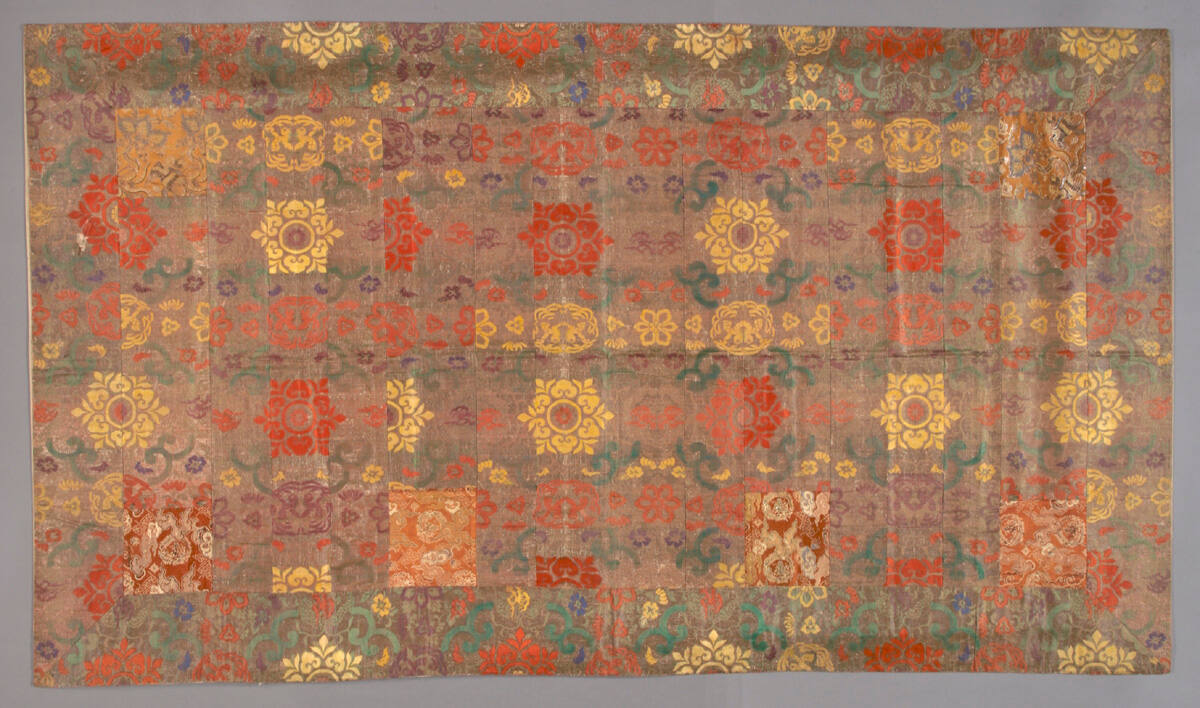 MediumBrown ground silk brocade with orange, green, and yellow threads and low quality gold-leaf wrapped around paper threads; shiten of brown ground silk brocade; niten with orange ground silk brocade; white twill weave silk lining