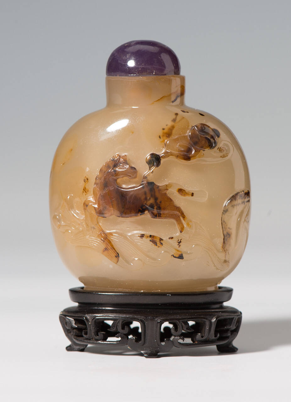 DescriptionOf rounded form, carved in relief making use of the dark-brown suffusions in the stone, the front with a horse prancing over crested waves, the reverse carved in low relief with a lotus plant.