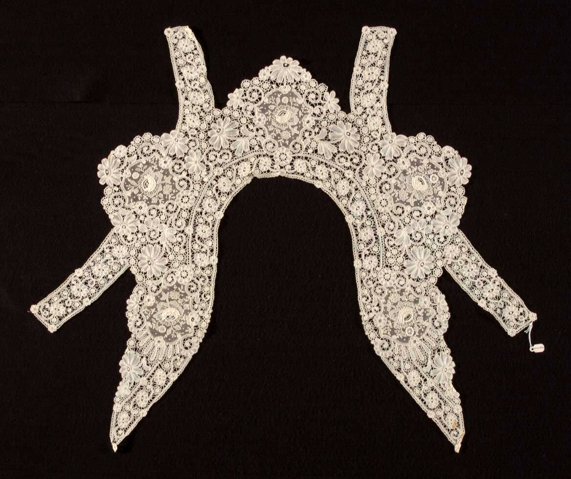DescriptionMixed needle and bobbin lace of the type known as Duchesse de Bruxelles. Mainly rather coarse bobbin lace with cartouches filled with point de gaze mesh and naturalistic flowers, including three-dimensional applied petals. The lace is shaped like a wode collar with long points at the center front, but the addition of straight bands to the front and back edges indicate that it was intended to be inset in a loosely cut garment, perhaps a tea gown or negligée.