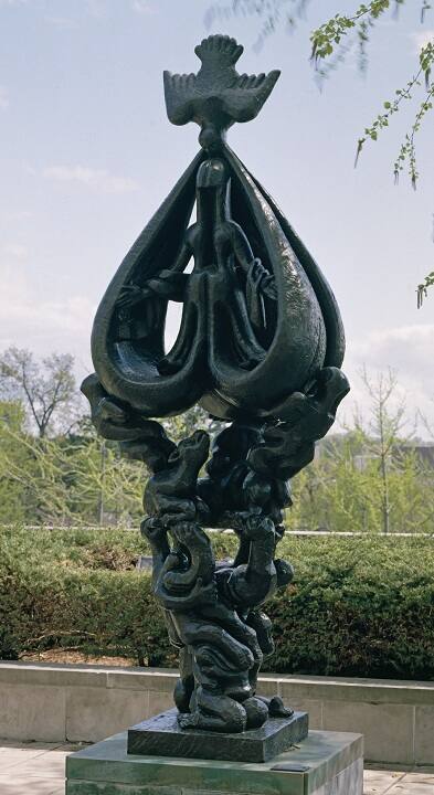 Gallery LabelPeace on Earth incorporates themes and motifs that Lipchitz had been exploring for 20 years. The knotted masses at the base represent prima materia, the raw matter from which all things emerge. Progressing upward are depicted: the Lamb of God, angels, the Virgin Mary and ultimately the Holy Spirit, in the traditional form of a dove. Peace on Earth is an optimistic work expressing the transformation of flesh into spirit. Its broader, underlying theme of metamorphosis occupied Lipchitz throughout his career.