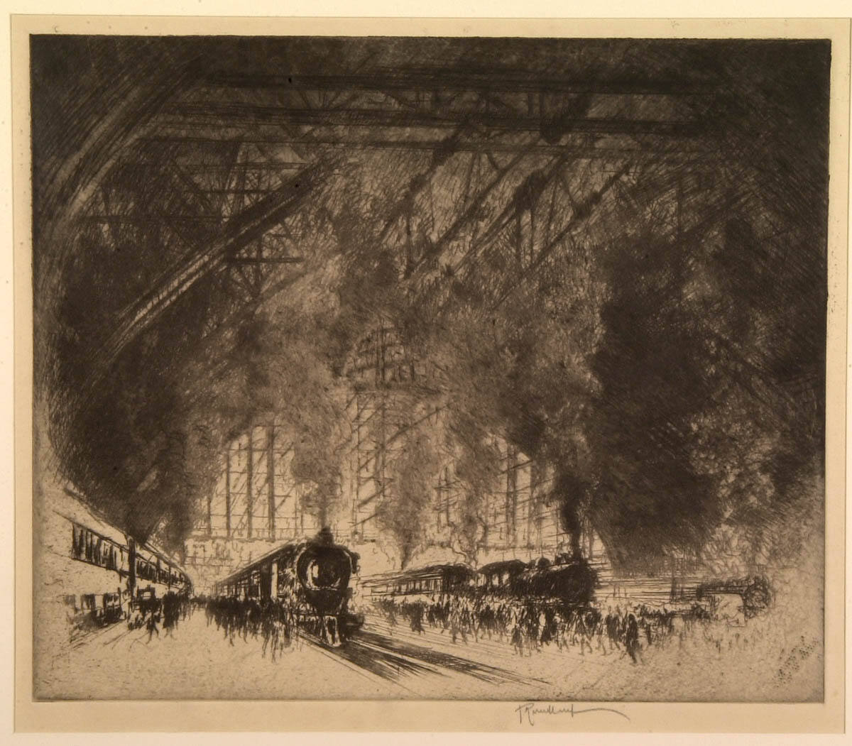 Gallery LabelPollution is clearly not considered an issue in this view of the train station at Broad Street, Philadelphia. The bustle of modern American life is vividly evoked. By this date the etching revival has become impressionistic, and the sketchily defined figures are like those in Claude Monet’s Boulevard des Capucines in the Nelson-Atkins' collection.