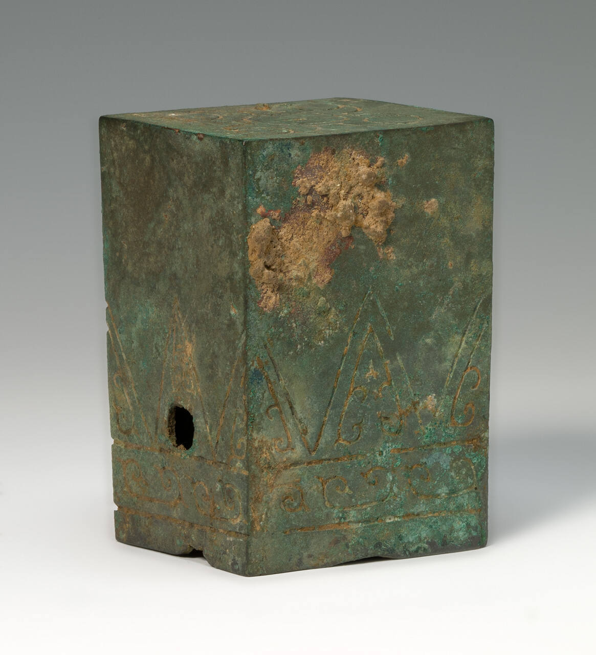 DescriptionRectangular shape, hollow, one end open, a hole in both sides. Incised abstract designs on surface.ProvenanceT'ang Hsiao Wu, Peiping (modern-day Beijing), China, by March 30, 1934;