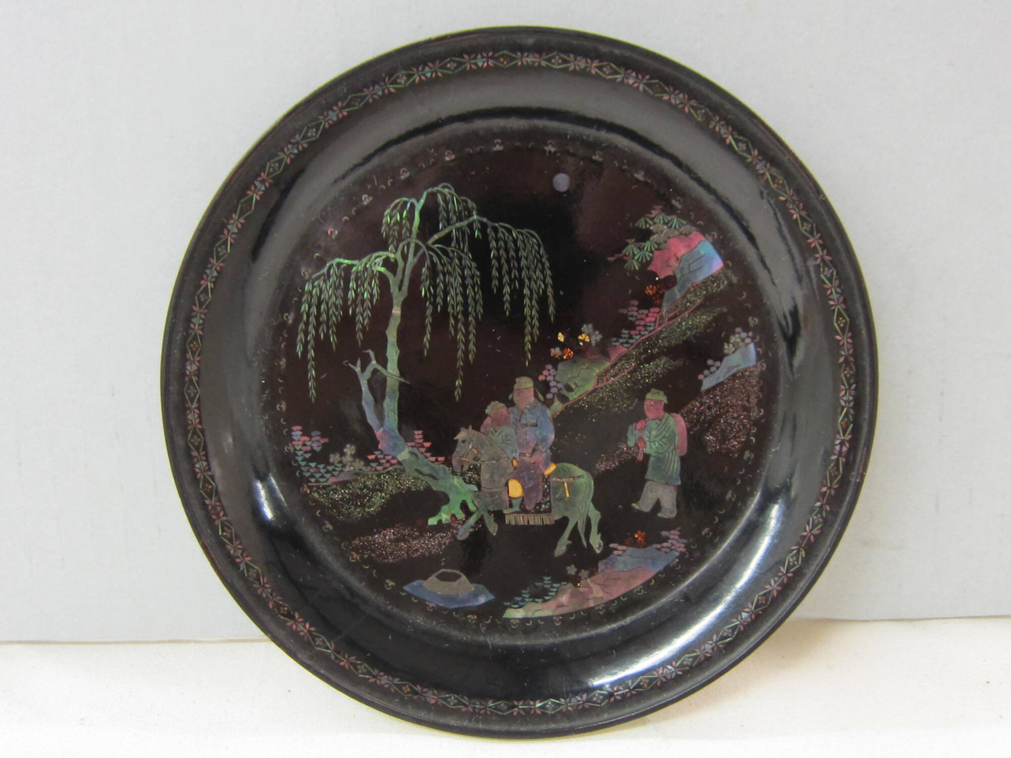 DescriptionLacquered wood plate with a design of people and scenery in a mother-of-pearl inlay on a black lacquer background.