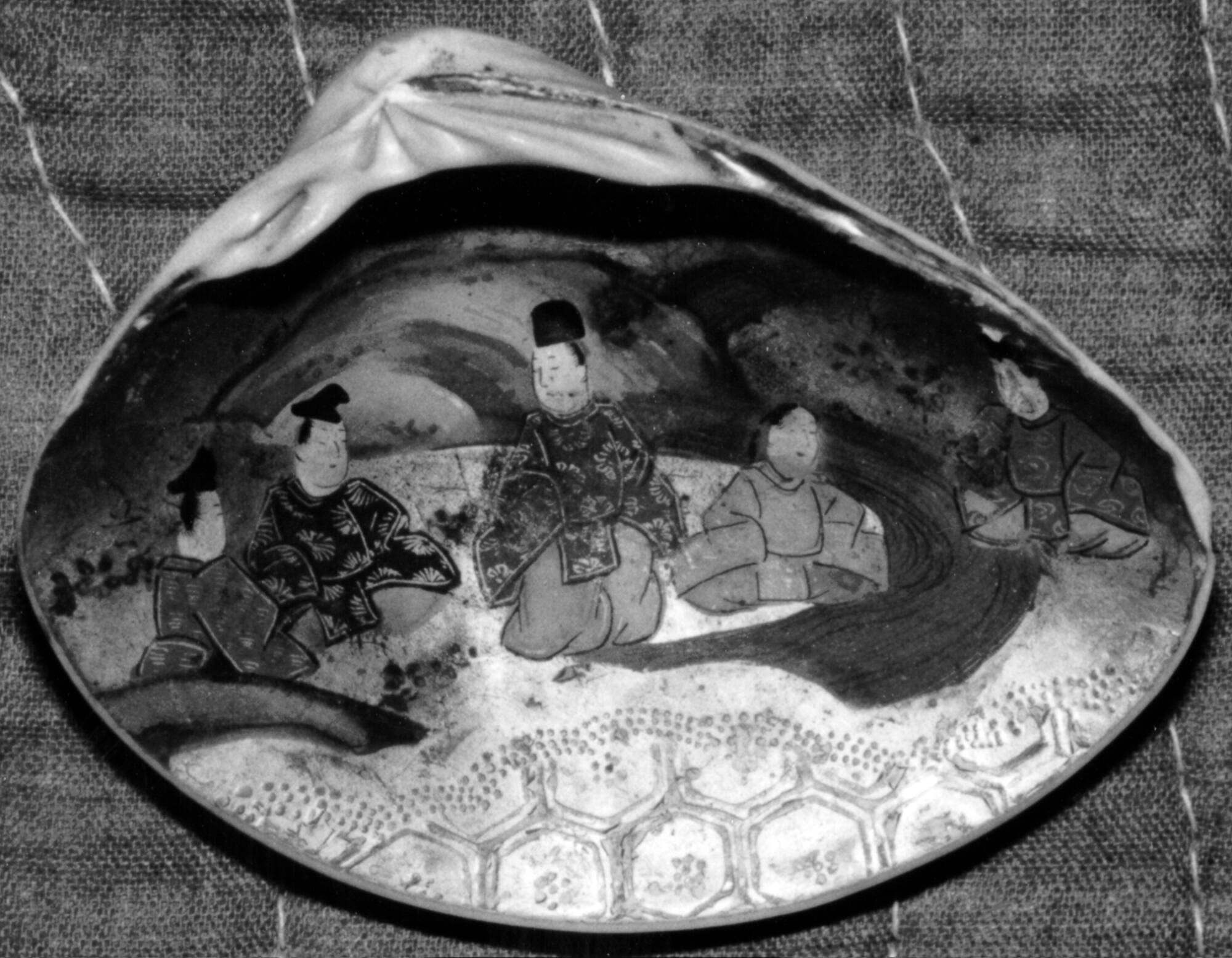 DescriptionOne of fifty clam shells. The shells are slightly smaller than a human palm, decorated with paintings on gold paper pasted to the iridescent inside surface. The top and bottom portions of the paper of each shell is embossed with hexagonal patterns. The images in the middle are mostly interior scenes with figures in bright Japanese costume. Men appear in rigid court robes. Women's long black hair streams down their backs. The paintings are peeling off at the edge. The shells were formerly stored in two gridded wooden boxes, 25 in each.Gallery LabelThese shells were used in the shell-matching game, kai-ooi, especially popular at New Year’s time. Two sets of shells, containing 360 pieces, were painted with identical scenes from classical Japanese novels, such as the Tale of Genji here. One set would be placed face-down in front of the players, and the second set remained in a box. Players removed the shells one at a time from the box. They looked at the scene on the shell and attempted to find its mate by turning over one shell from the other set at each turn. The one with the most pairs at the end of the game was declared winner.